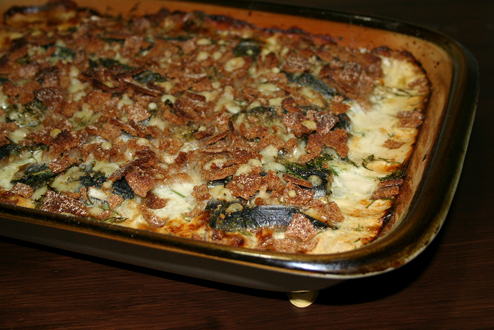 Vuokaan voi lisäillä maun mukaan esimerkiksi tuorejuustoa, maustettua ruokakermaa ja juustoraastetta. Tämänkertaisen vuoan päälle tuli murskattua hapankorppua ja jääkaappiin jääneet juustoraasteen jämät.